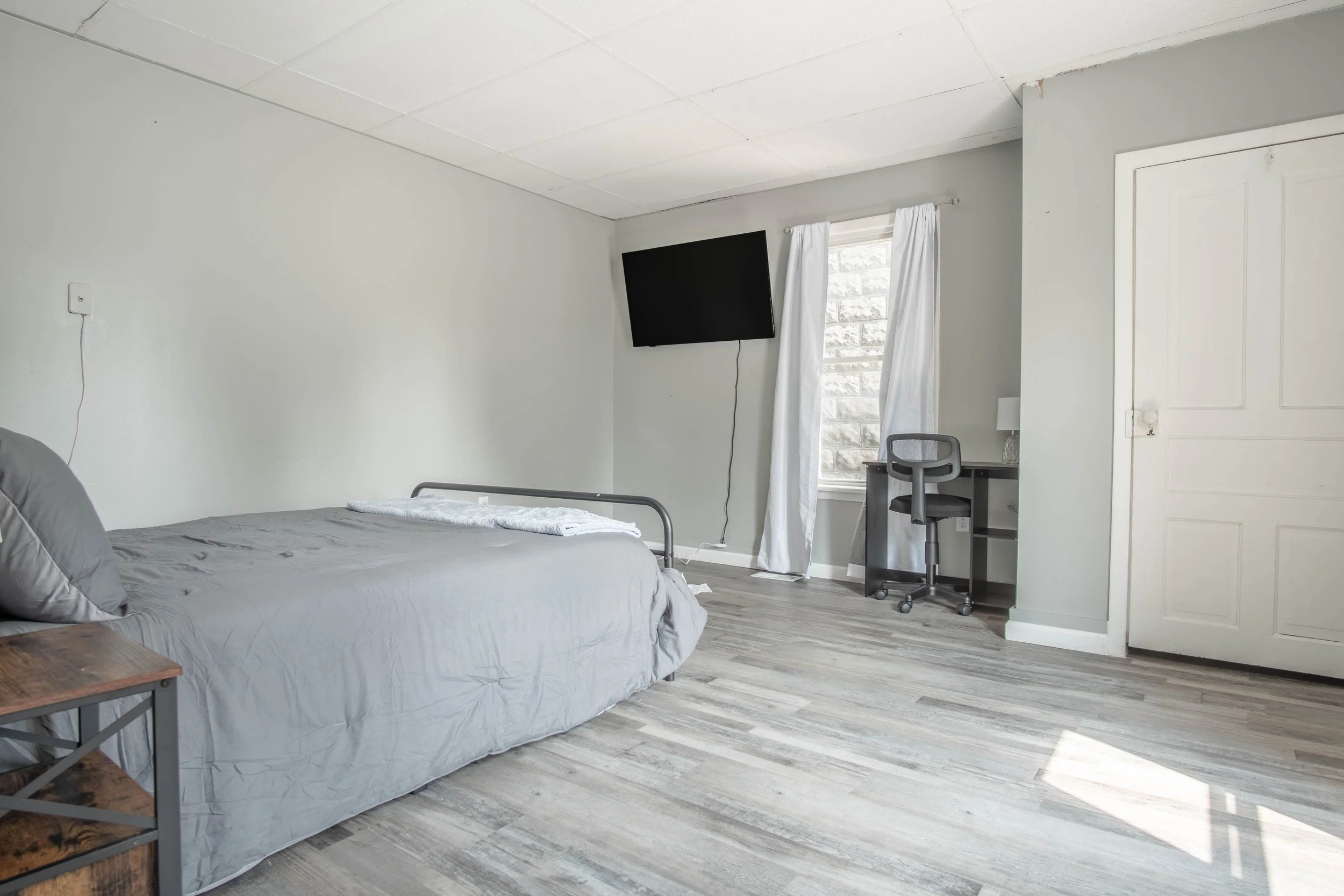 The private bedroom features a queen bed with fresh linens, nightstands, a desk and chair, a 50” smart TV, and a full-length mirror with hangers for clothing. A pack and play is available for families traveling with young children, offering added flexibility.